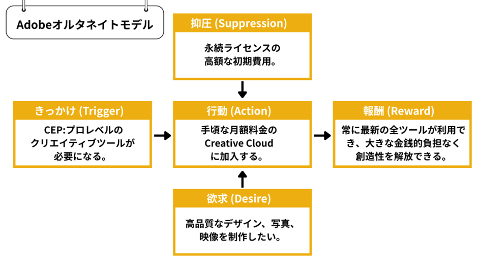 この「抑圧」に対し、「未顧客」はフリーソフトで我慢するなどの「代替行動」を取っていました。しかし、それでは「プロ品質のツールを使いたい」という彼らの「欲求」は満たされません。アドビはこの状況を正確に捉え、ビジネスモデルの変革を決断します。