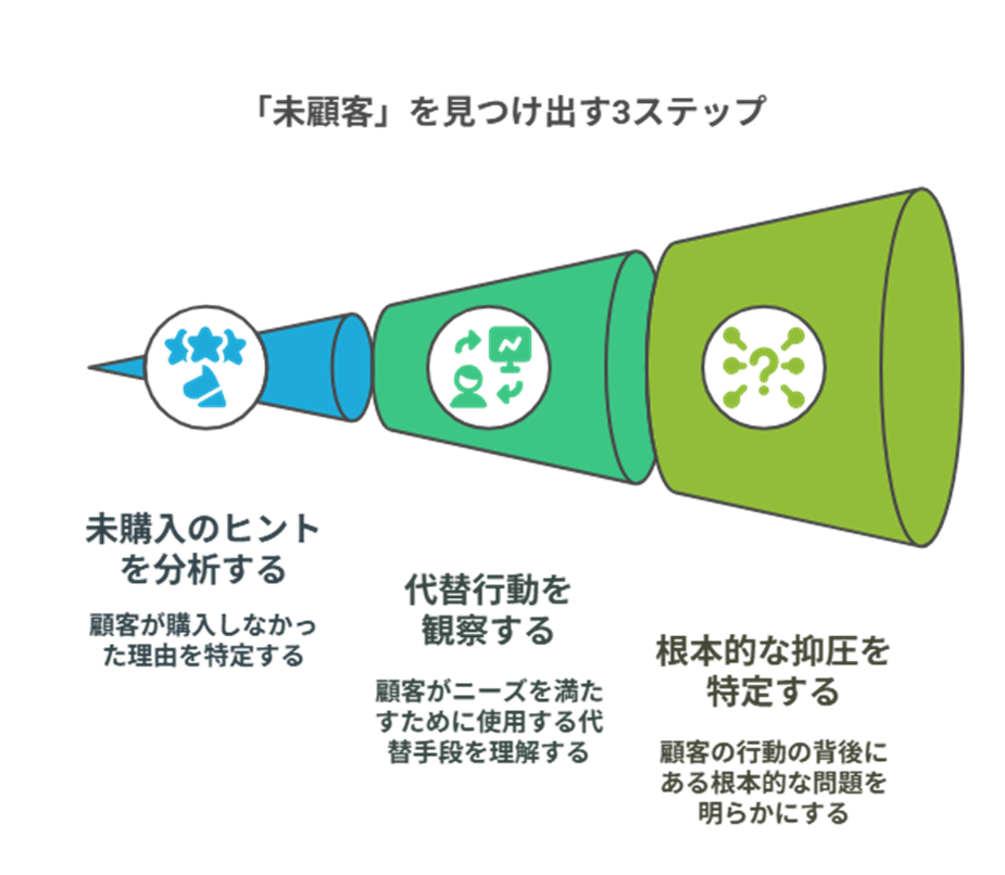 この3つのステップは、未顧客理解の第一歩です。この分析から見えてきた「抑圧」こそが、あなたの事業が次に乗り越えるべき“壁”であり、成長のチャンスです。
