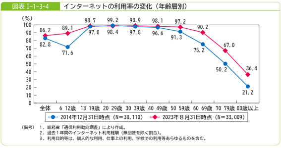 インターネットやソーシャルメディアの利用は、若年層に限らず中高年層にも広がりを見せています。総務省「通信利用動向調査」によると、2023年時点で13歳〜69歳のすべての年齢層でインターネット利用率が90%を超えており、特に60歳代以上での伸びが顕著です。2014年と比べて、60歳代では15ポイント、70歳代でも約20ポイントの増加が確認されています。