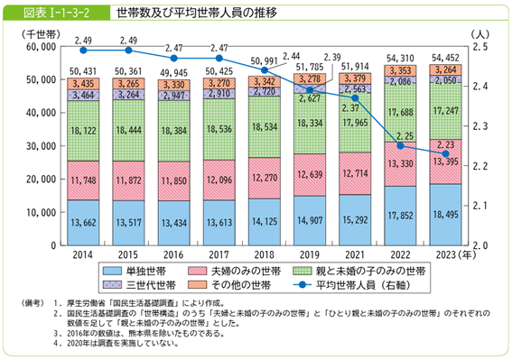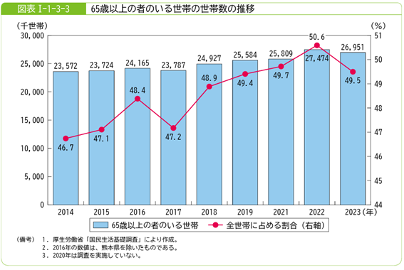 また、世帯構造にも変化が見られます。2023年時点のデータでは、単独世帯と夫婦のみの世帯の増加が続く一方で、平均世帯人員は2.23人まで減少しました。さらに、「65歳以上の者がいる世帯」は全世帯の50.6%を占めており、高齢者を中心とした生活実態が、今後の消費動向に一層影響を与えることが想定されます。