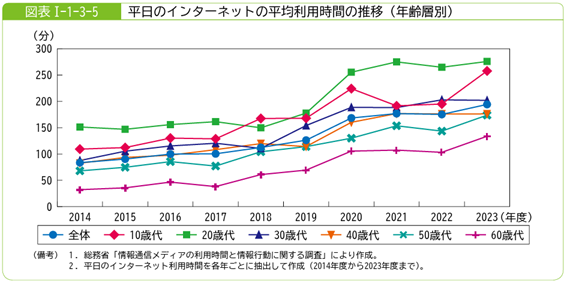 加えて、「情報通信メディアの利用時間と情報行動に関する調査」によれば、インターネットの平均利用時間はすべての年齢層で10年前より増加しており、デジタル空間での接触時間が確実に長くなっています。