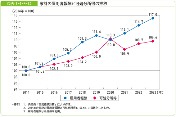 家計所得の構造にも変化が見られます。2023年時点での勤労者世帯の雇用者報酬は2014年比で約17%増加しているものの、可処分所得の増加は約10%にとどまっており、所得の伸びが家計の消費余力に十分反映されていない実態が浮き彫りとなっています。その要因として、所得税や社会保険料といった負担の増加が挙げられています。