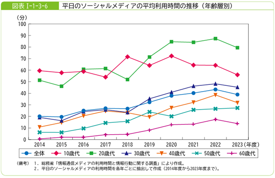 ソーシャルメディアに関しても、40〜60代の利用率や平均利用時間が着実に増加し、SNSを通じた商品・サービスへの接触や購買の機会が日常的になっています。