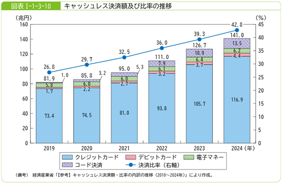 さらに、決済手段の面でも変化が見られます。キャッシュレス決済比率は2024年時点で42.8%にまで上昇しており、内訳としてはクレジットカード(82.9%)が主流ながら、コード決済も全体の約1割(9.6%)を占めるまでに浸透しています。こうした決済手段の多様化は、リアルとオンラインを問わず購買体験を柔軟にし、消費者の利便性向上に寄与しています。