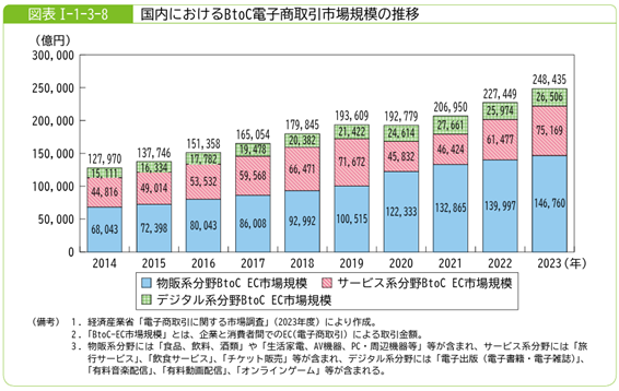 こうした背景のもと、電子商取引(EC)の市場も大きく成長しています。経済産業省の調査によると、2023年の国内BtoC-EC市場は約24.8兆円に達し、2014年比で約2倍に拡大しました。中でも物販系分野は約2.2倍に、サービス系分野も約1.7倍に成長しています。また、フリマアプリなどに代表されるCtoC取引も2.5兆円規模まで拡大し、消費者間取引の存在感が高まっています。