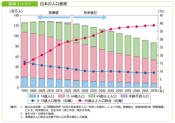 日本の総人口はすでに減少局面に入っており、国立社会保障・人口問題研究所の推計によれば、2070年には現在の約1億2,000万人から約8,700万人へと約3割減少する見込みです。出生率の低下により少子化が進む一方で、平均寿命の延伸により高齢者人口の割合は今後さらに高まっていくと見られています。