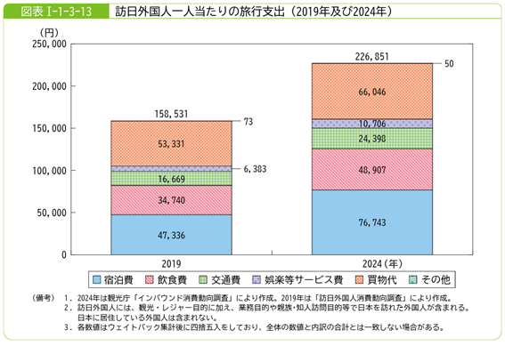 さらに注目すべきは、訪日旅行者1人あたりの消費額が22.7万円に達し、2019年比で約4割増加している点です。背景には円安や物価上昇の影響に加え、長期滞在や体験型消費の増加があると考えられています。特に、「現地ツアー」「テーマパーク」「ガイドサービス」などの娯楽・サービス関連支出は約70%増加しており、物の購入だけでなく「コト」にお金を使う傾向が強まっています。