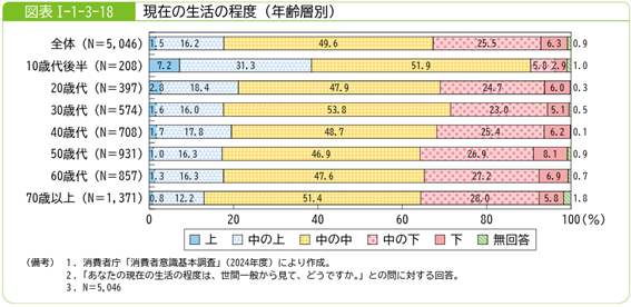 生活の自己評価については、「自分の生活は世間一般から見て中の中」と答えた人が全体の約半数にのぼり、自己認識として“中流意識”が根強く残っていることがうかがえます。ただし、若年層では「上」または「中の上」と評価する人の割合が他の世代より高く、将来への期待や楽観性の違いが表れているともいえます。