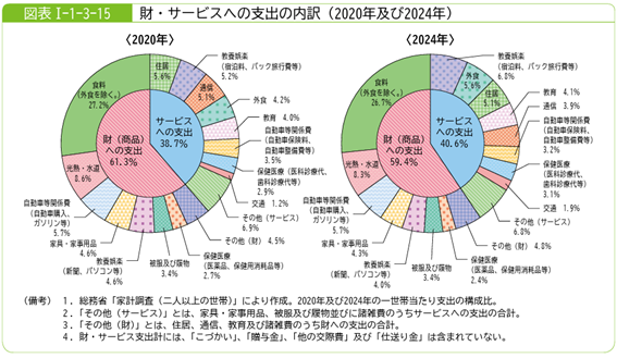 また、家計の支出内容にも変化が生じています。総務省「家計調査」によると、2024年の「二人以上の世帯」における一世帯あたりのサービスへの支出比率は40.6%となり、2020年の38.7%から拡大しました。とくに「教養娯楽(宿泊料やパック旅行など)」や「外食」など、コロナ禍で落ち込んだ分野の回復が顕著であり、生活様式の正常化とともにレジャー関連消費が戻ってきていることがうかがえます。