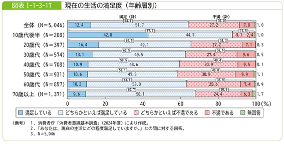 消費者庁が実施した「消費者意識基本調査(2024年度)」によれば、現在の生活に「満足」と答えた人の割合は64.1%となり、「不満」と答えた人(35.0%)を大きく上回る結果となりました。年齢層別で見ると、10歳代後半では特に満足度が高い一方で、20代から50代にかけては年齢とともに満足度がやや低下する傾向が見られました。子育てや就業、住宅ローンなど、生活コストの増加が影響している可能性もあります。