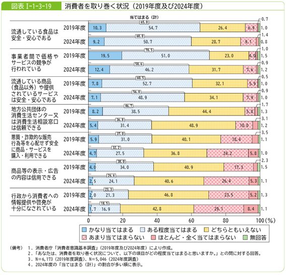 消費者庁が実施した2024年度の「消費者意識基本調査」では、商品やサービスの安全性については比較的高い評価が得られている一方で、販売・広告手法や行政の情報提供に対する信頼度は依然として低い傾向が見られました。