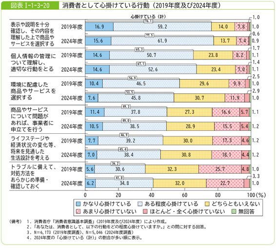 一方で、こうした環境の変化に対する対応にはばらつきも見られます。表示確認や個人情報管理といった基本行動は広く実践されている一方で、トラブルへの備えや将来設計への意識は限定的であり、信頼を損なう不安も依然として根強く残っています。また、広告・表示への不信感や行政への期待の低さも浮き彫りとなり、情報の非対称性が消費者保護の課題として浮上しています。