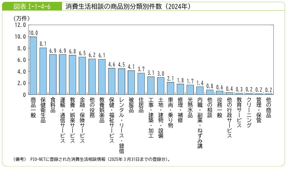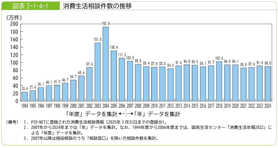 2025年6月に公表された令和7年版「消費者白書」では、第1部第1章 第4節「消費生活相談の概況」と第5節「消費者被害・トラブルの経験と被害・トラブル額の推計」において、消費生活相談の件数や内容の傾向、消費者トラブルの実態と経済的影響などがまとめられています。