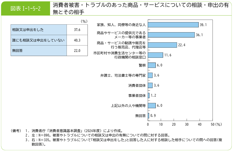 消費者トラブルに遭った際の「相談行動」にも焦点が当てられています。調査によると、消費者被害の経験者のうち実際に誰かに相談した人は全体の37.6%にとどまり、4割を超える人が誰にも相談していないことがわかりました。