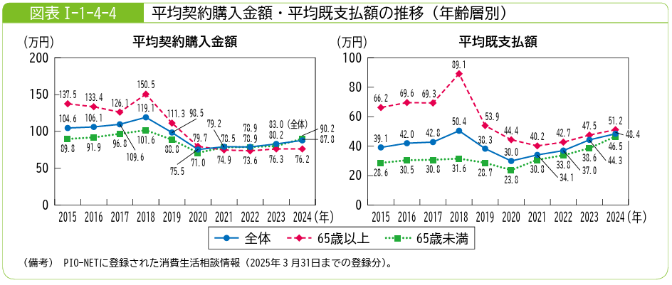 2024年の消費生活相談における1件あたりの平均契約購入金額は87.8万円で、前年より増加しました。実際に支払われた「平均既支払額」は48.4万円で、こちらも前年から上昇しています。