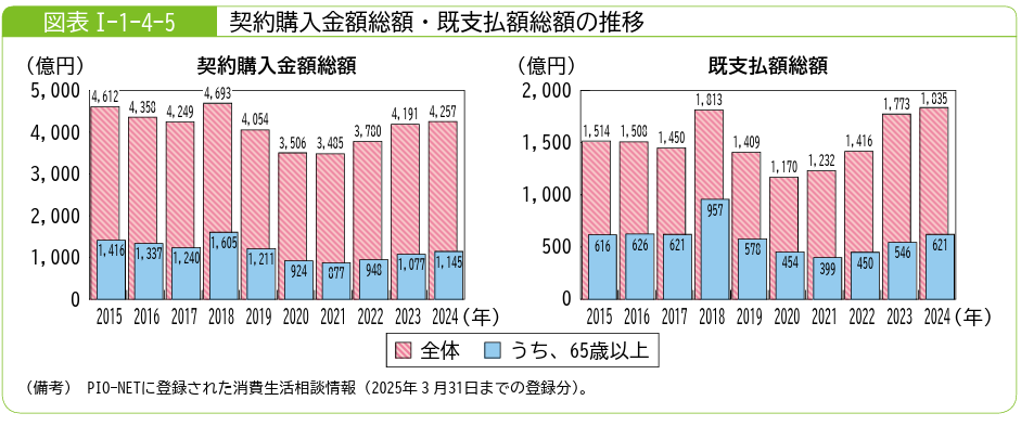 全体の契約購入金額総額は4,257億円、既支払額総額は1,835億円となっており、特に65歳以上の高齢者が占める割合はそれぞれ26.9%と33.9%に上ります。
