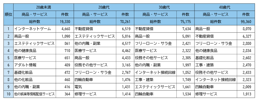 年齢層別にみると、20歳未満では「インターネットゲーム」、20歳代では「不動産貸借」に関する相談が多く、30代以降では「工事・建築」や「役務その他サービス」(副業・サポート契約など)が上位に入っています。年代ごとに特有の生活環境や契約ニーズが相談内容に反映されていることが伺えます。