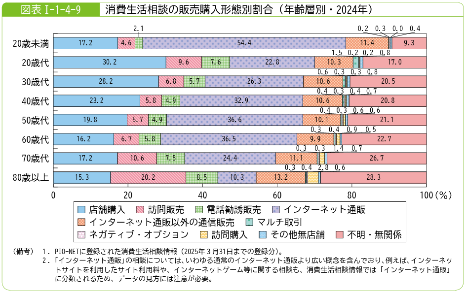 販売・購入形態別に見ると、2024年も「インターネット通販」が最も多く、20歳未満では過半数(54.4%)を占めています。40〜60歳代では「店舗購入」と「インターネット通販」の比率が拮抗していますが、70歳代以降になると「訪問販売」「電話勧誘販売」など対面型の販売形態によるトラブルが増加する傾向が見られます。