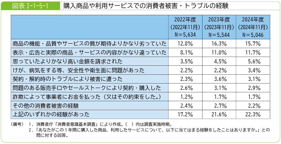 消費者庁が実施した「消費者意識基本調査」によると、消費者被害・トラブルを「経験した」と回答した割合は22.3%であり、被害の内容としては、「商品の機能・品質やサービスの質が期待よりかなり劣っていた」「表示・広告と実際の商品・サービスの内容がかなり違っていた」「思っていたよりかなり高い金額を請求された」といった事例が多く、悪質商法による被害が後を絶たない現状が読み取れます。