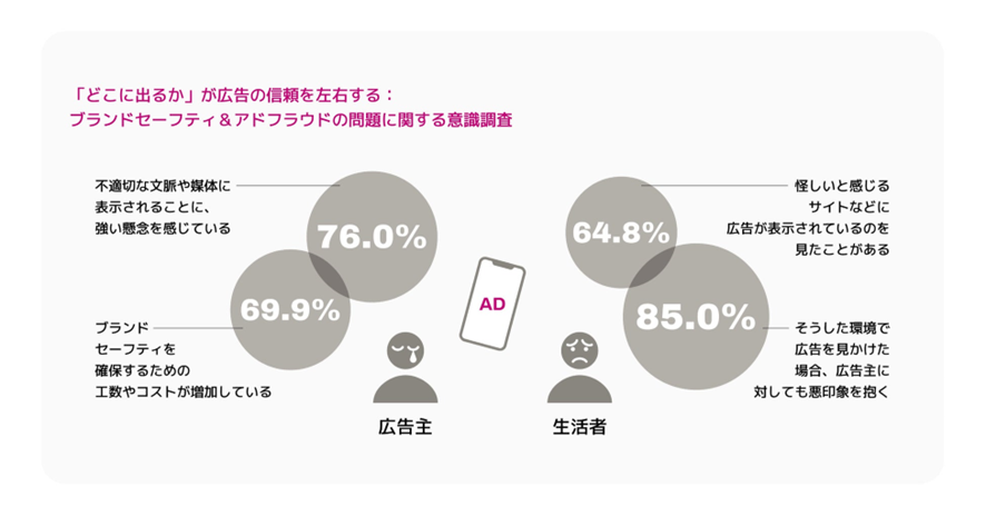 SNS上の炎上投稿や、過激なコンテンツの近くに広告が表示されるケースもあり、掲載面がブランドイメージに与える影響の大きさが浮き彫りになっています。さらに、広告主の72.4%が「広告が実際に人間に届いているのか不安を感じている」と回答しており、アドフラウド(不正な配信)への不信感も根強い状況です。