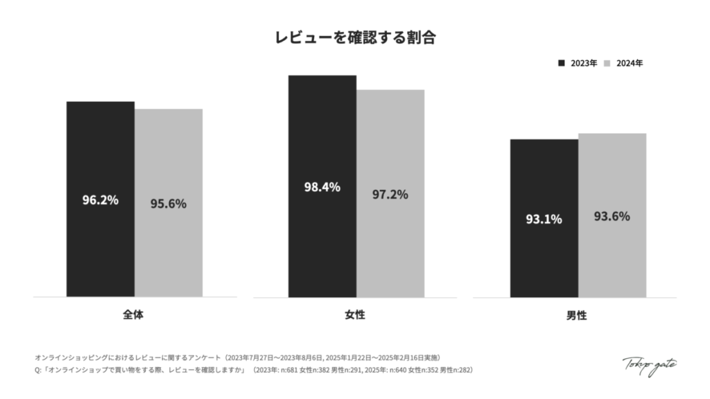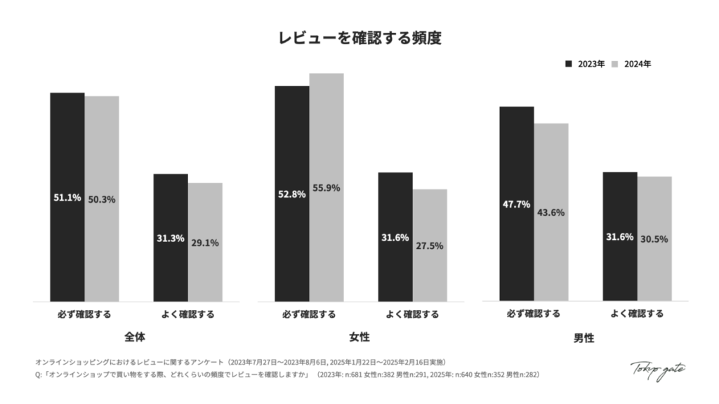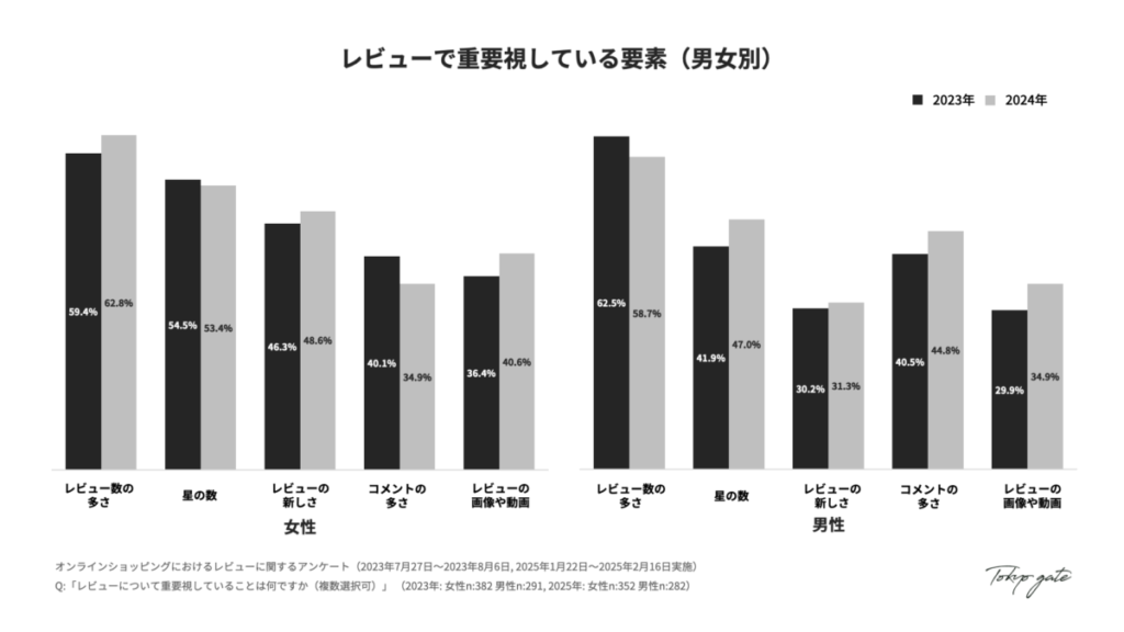 2023年と2024年の比較分析を通じて、レビューの重要性が依然として高い一方で、消費者のレビューとの向き合い方が変化し、かつ男女差がより明確になっている実態が明らかになりました。