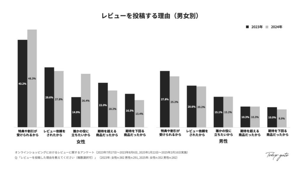 - レビュー投稿理由として「誰かの役に立ちたい」という利他的な動機は、2023年度に比べ女性において約10ポイントの上昇が見られます。