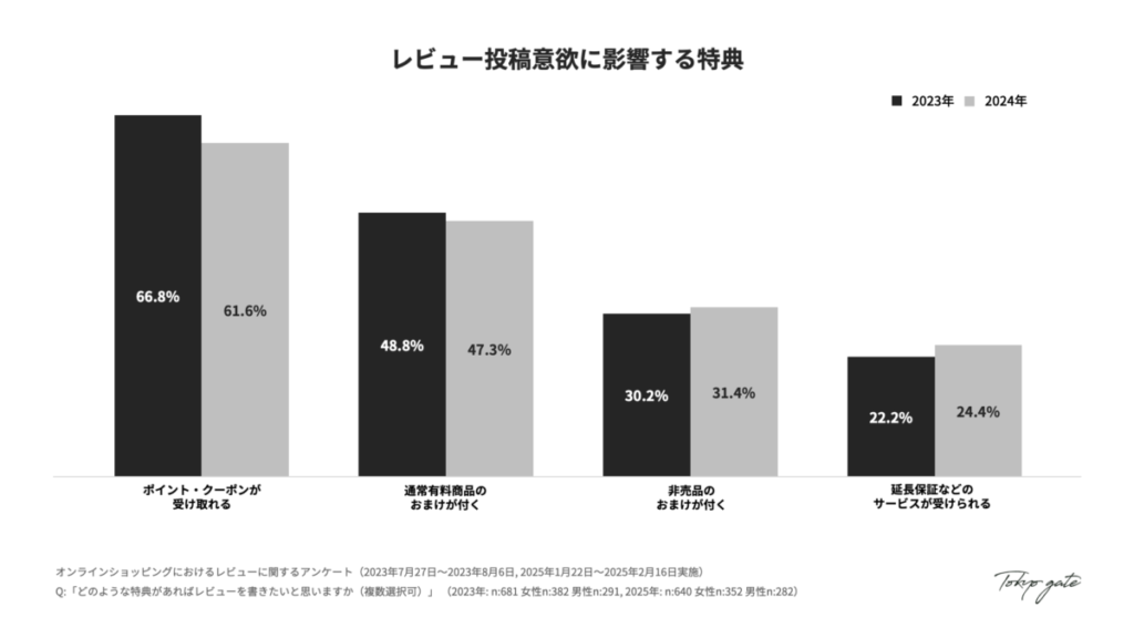 - レビュー投稿意欲に影響する特典では、2023年度に比べ「非売品のおまけ」「サービスの提供」への関心の高まりが見られます。