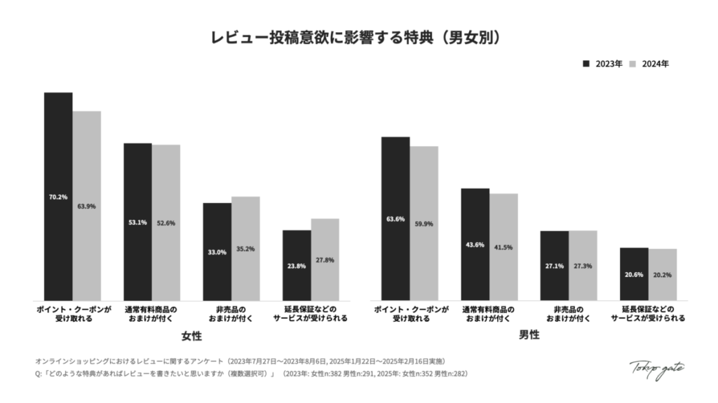 レビュー投稿意欲に影響する特典について、女性は2023年から2024年にかけて、「非売品のおまけ」や「延長保証などのサービス」で2~4ポイントの上昇が見られます。男性では「ポイント・クーポン」と「通常有料商品のおまけ」でそれぞれ約2~4ポイントの減少が見られました。
