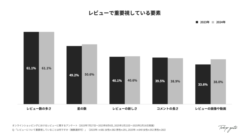 - レビューで重視する要素としては、「投稿数の多さ」が引き続きトップですが、2023年度に比べ「レビューの画像や動画」の重要度が約4ポイント上昇しています。