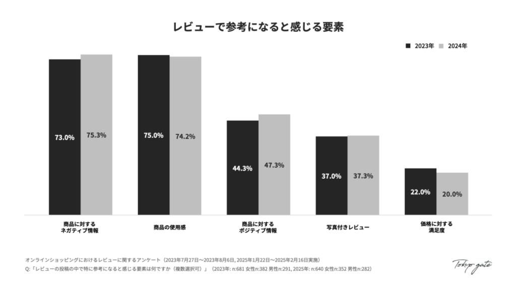 - レビューで参考になると感じる要素では、2024年度は商品に対するネガティブ情報とポジティブ情報、双方への関心が高まる傾向が見られました。