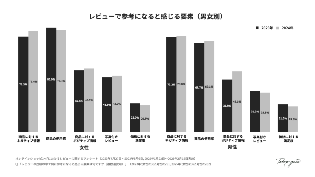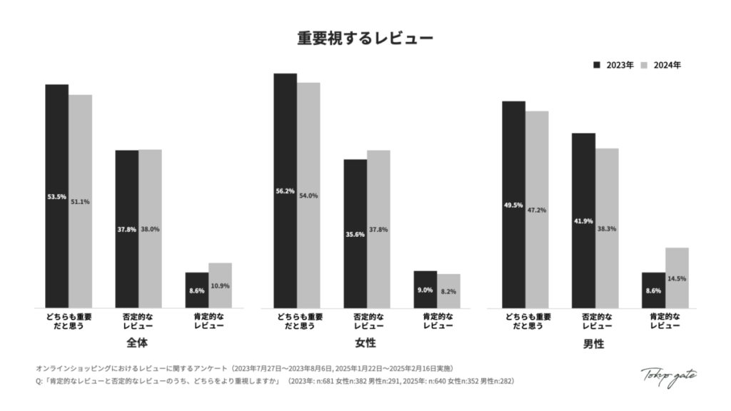 - 重視するレビューについて、女性は「否定的なレビュー」、男性は「肯定的なレビュー」をより重視する傾向が強まっています。