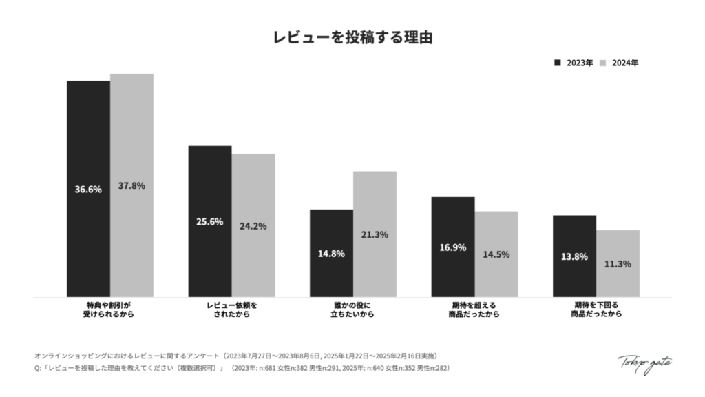 - レビュー投稿理由として「特典や割引の提供」は、2024年度においても最多の投稿理由となりました。