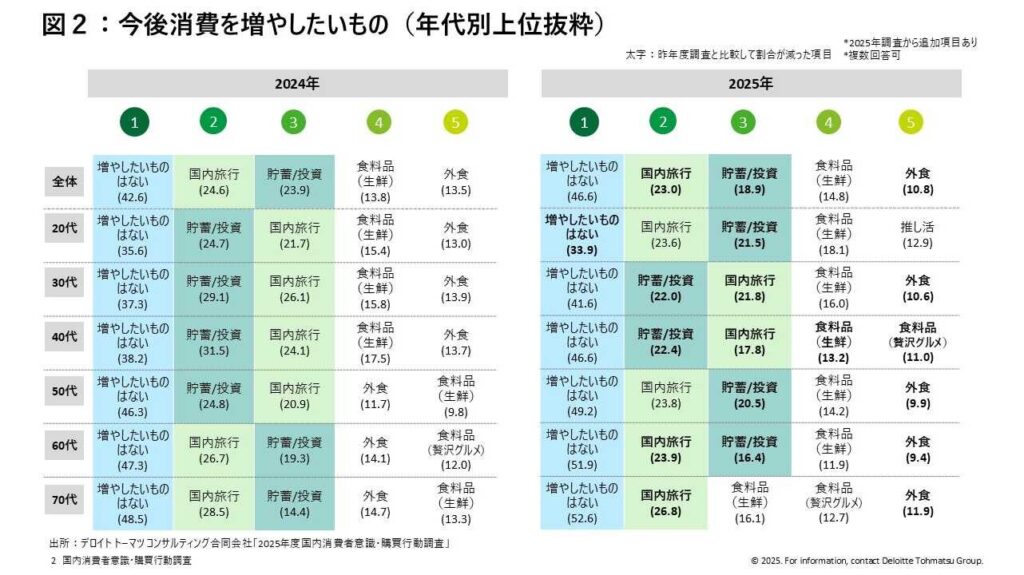 世代別の消費意欲では20代だけが「消費を増やしたい」意欲を維持しており、特に「推し活」への支出増意向が12.9%と他世代と一線を画します。また、国内旅行や食料品なども支出を増やしたい分野として挙がっており、若年層ならではの消費行動が目立ちます。