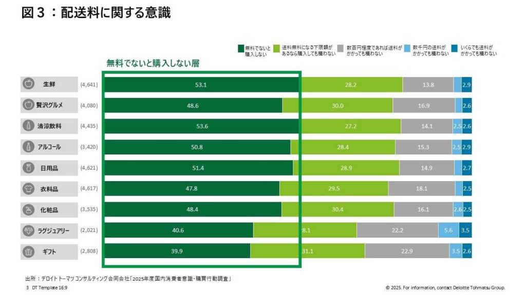ただし、「送料無料の下限額があれば購入してもよい」(約3割)、「数百円程度の送料は許容する」(約2割)と回答した人も一定数おり、送料無料にこだわりすぎない柔軟な層も存在しています。