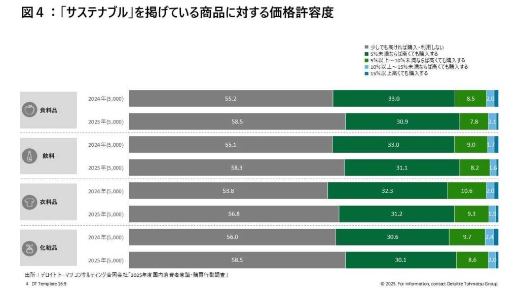 「サステナビリティを意識して商品を選ぶ」とした人は約30%で、特に化粧品や衣料品では若年層に意識の高まりが見られます。しかし、「価格が高いから買わない」との回答は年々増加しており、2025年度では食料品で58%、衣料品で57%が「少しでも高ければ買わない」と答えています。