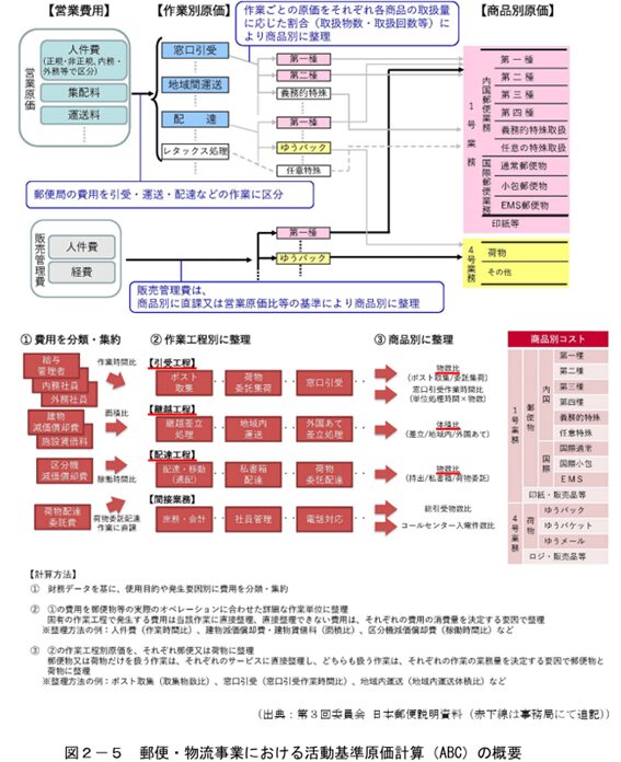 上限認可制度の下では、適正な原価と利潤の算定が重要です。日本郵便は営業費用の算定に活動基準原価計算(ABC)を導入し、作業単位別に費用を細分化して郵便と荷物に配賦しています。