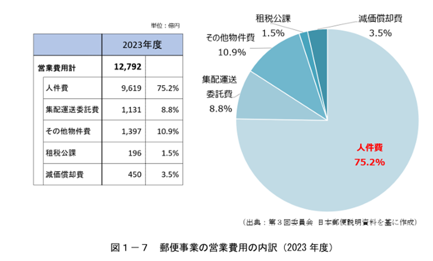 郵便事業は労働集約的であり、2023年度の営業費用1兆2,792億円のうち75.2%が人件費です。近年は適正な賃上げや労働需給の逼迫により人件費単価が上昇しており、物価高騰を受けた集配運送委託費の増加も収支を圧迫しています。2022年度の赤字額は211億円、2023年度は896億円と急拡大し、単発の料金改定では黒字化を維持できないとの試算が示されています。