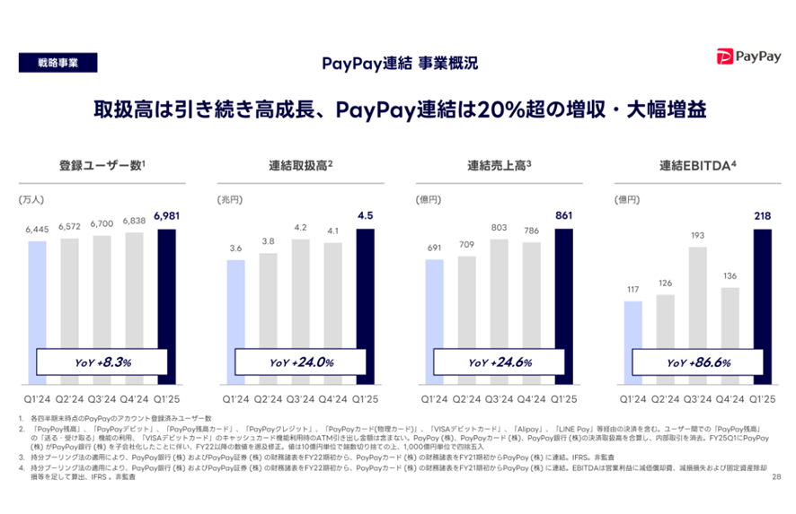 戦略事業は売上収益966億円(同+22.1%)、調整後EBITDA209億円(同+264.0%)と大幅に伸長しました。主なけん引役はPayPay連結で、同サービスの登録ユーザー数は約6,981万人と前年同期比8.3%増、連結取扱高は4.5兆円(同+24.0%)、連結EBITDAは218億円(同+86.6%)に拡大しました。決済手数料やリボ残高増による金利収入が増加したほか、住宅ローンを中心としたPayPay銀行の貸出金残高が順調に伸びたことも寄与しています。