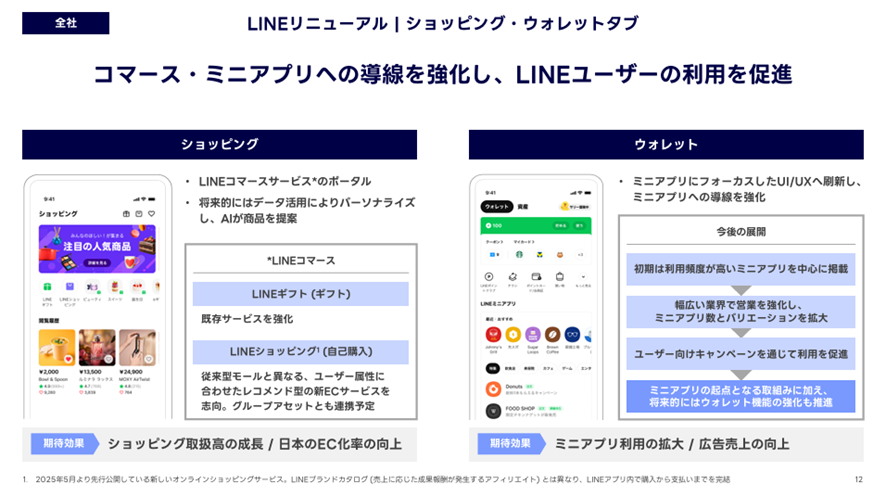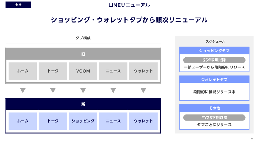 同社は中長期成長に向けた投資も加速しています。2025年7月からLINEアプリのリニューアルを段階的に開始し、下期には「ショッピング」「ウォレット」タブを追加する予定です。