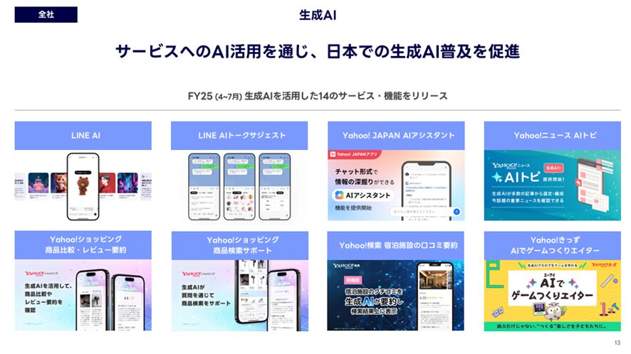 生成AI分野では2025年度4〜7月の間に14の生成AIサービスや機能をリリースし、LINE AIやYahoo! JAPANのAIアシスタントなどを提供しています。前期記事で示された「AIエージェント」構想でも、ユーザーの目的に応じてチャットや検索から購入・予約・決済まで一気通貫で支援するサービス群を構築しており、ミニアプリ連携を強化しながら2026年度以降の本格収益化を目指しています。