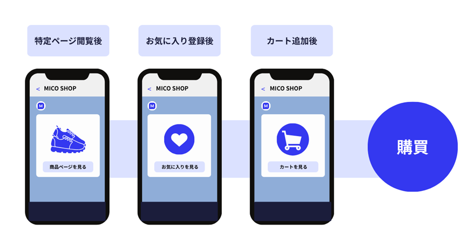 購買データと合わせて活用したいのが、ECサイト上でのWeb行動履歴です。特にカート内商品のリマインドや、お気に入り登録商品の再入荷通知といった「購買に近いアクション」から優先的に実施することで、高い配信効果が期待できます。
