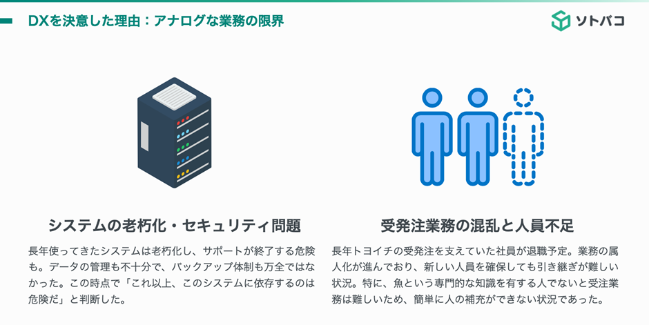 トヨイチは、全国の漁港から鮮魚を仕入れ、飲食店などに卸しているのですが、老朽化したシステムと属人化した業務で下記のような課題を抱えていました。