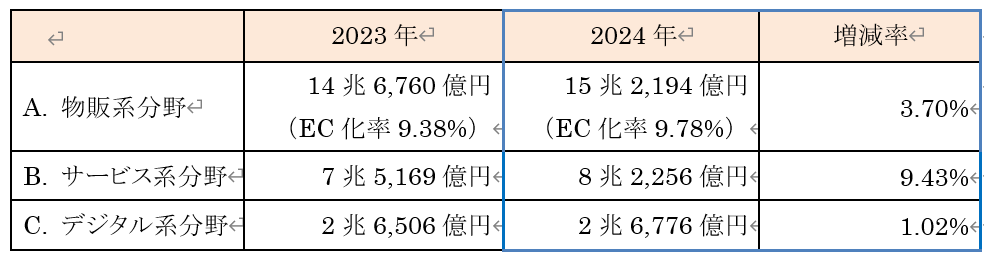 EC化率が特に高いのは「書籍・映像・音楽ソフト」(56.45%)や「家電・PC関連」(43.03%)であり、物販系分野の中でもデジタル適合度の高い商材が存在感を示しています。