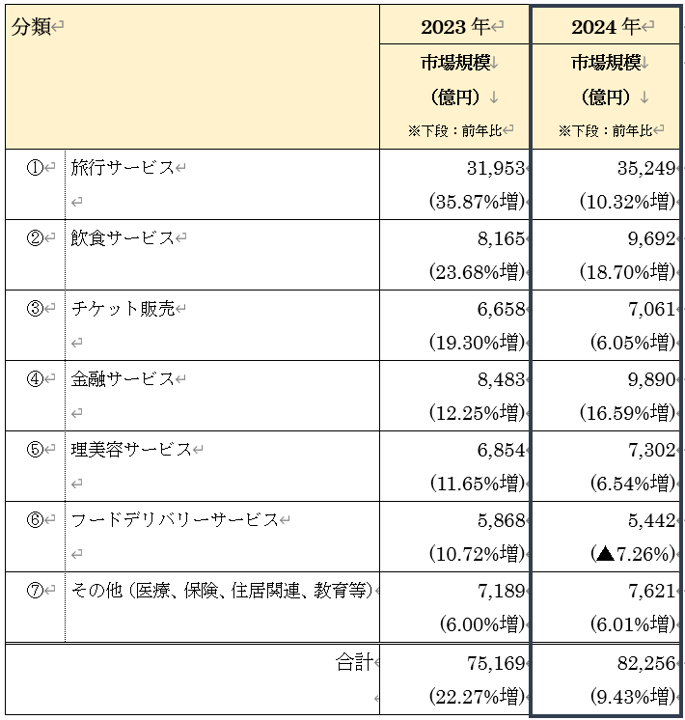 サービス系分野では「旅行サービス」が3兆5,249億円と大きなシェアを占めました。コロナ禍で打撃を受けていた旅行、飲食、金融サービスは2023年に続き回復基調が鮮明です。