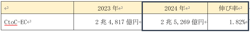 フリマアプリなどを中心とするCtoC-EC市場は、2024年に2兆5,269億円(前年比1.82%増)と推計されました。成長率は鈍化傾向にあるものの、日常生活に定着した売買形態として一定の市場規模を維持しています。