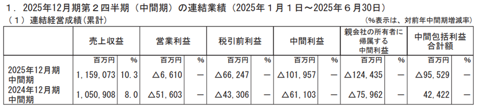 売上収益についても、前年比+33.5%と高い成長率を示していますが、これはモバイル事業の吸収合併による構造変化に起因する部分が大きい点には注意が必要です。具体的には、2025年第1四半期から「その他事業」として楽天エナジーの売上が加算されており、それが増収要因となっています。