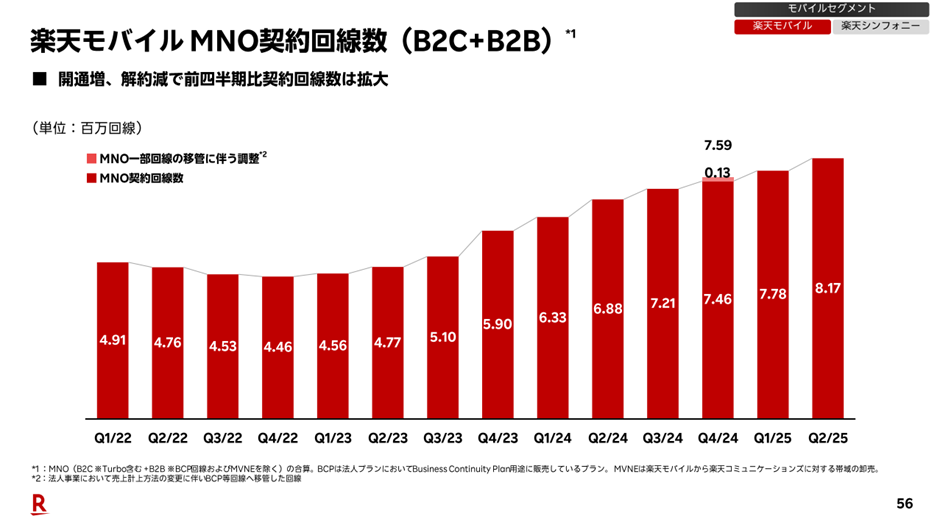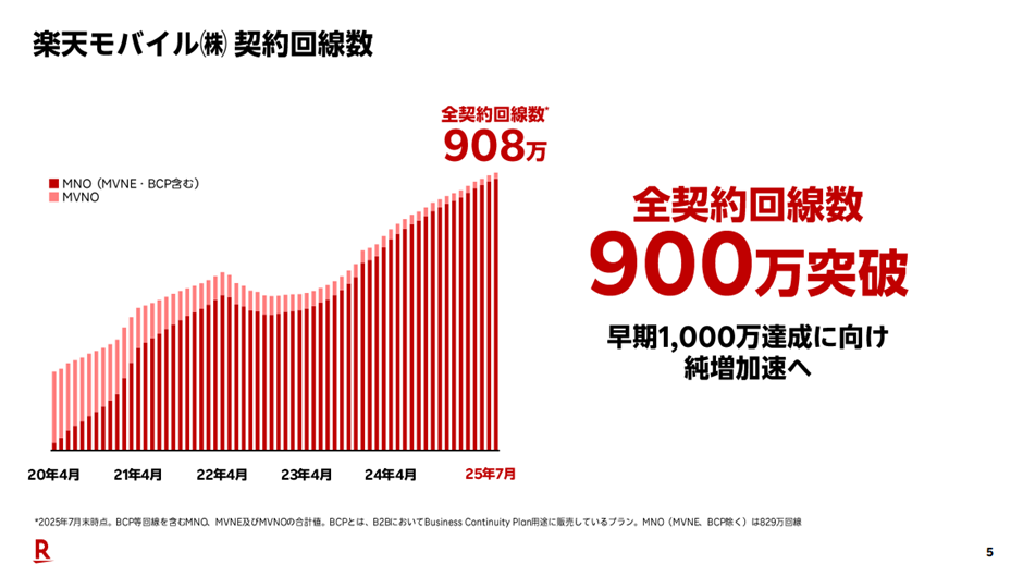 楽天モバイルの契約回線数は、2025年7月末時点で合計900万回線を突破したと発表されています。しかし、この数字はMNO(携帯キャリアサービス)に加えて、法人向けサービス(BCPプラン)も含まれており、MNO単体では829万回線にとどまります。