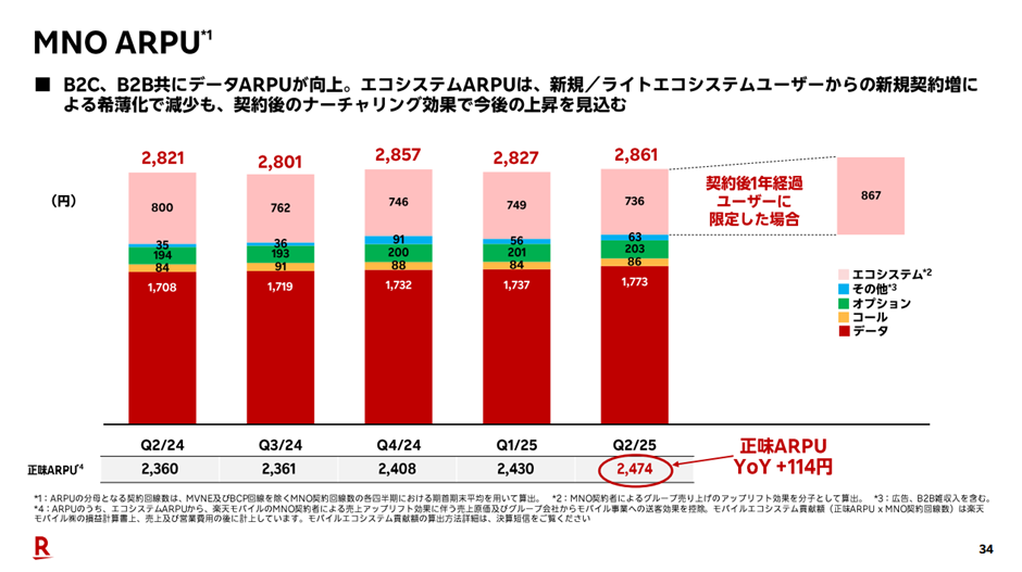 この「楽天エナジー分」を除いて見ると、モバイル単体の売上は24年Q4の820億円から約830億円と、半年でわずか10億円の伸びにとどまっています。これは、回線数が着実に伸びている一方で、ARPU(1ユーザーあたりの平均収益)が十分に向上していないことを示唆しています。
