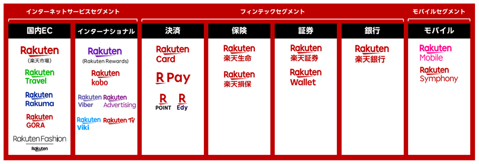 楽天市場は、楽天グループにおける「インターネットサービスセグメント」に含まれており、このセグメントは楽天全体の売上収益の約半分を占める重要な柱です。楽天市場をはじめ、楽天トラベル、楽天ブックス、ラクマ、楽天GORAなどが含まれており、いずれも生活インフラに近いサービスとして位置づけられています。