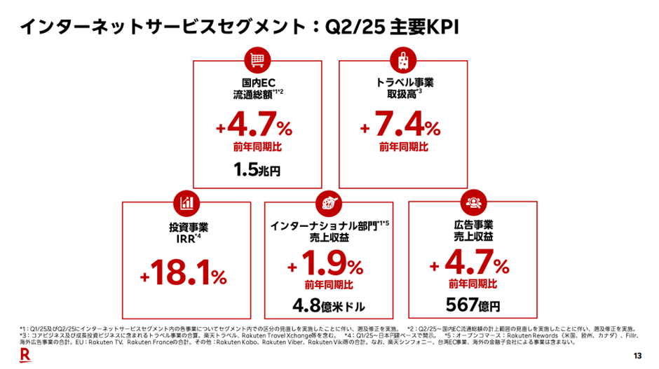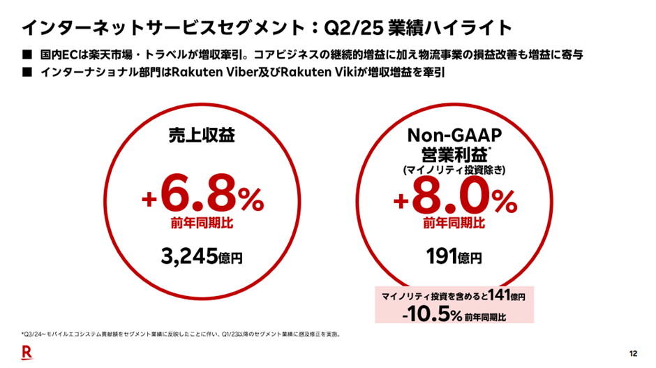 楽天グループにおいて重要な収益源であるインターネットサービスセグメント(楽天市場、トラベル、ファッションなど)は、今回の決算でも安定した成長を見せました。